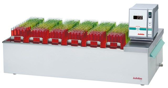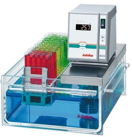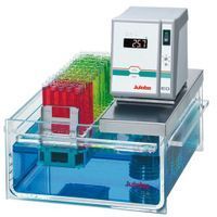 JULABO open heating bath circulators with bath tanks made of stainless steel, Plexiglas, or Makrolon are designed for internal and external temperature applications. They are primarily used for internal temperature control directly within the bath tank. External closed systems may be connected via the integrated pump connections. Models are available with a variety of bath sizes and other functional characteristics. A variety of bath inserts for laboratory glassware, bath covers, and adjustable floors are available as accessories. Common applications include temperature control of measurement cells, photometers, and samples; heating of glass flasks; and temperature testing of food, luxury articles, and materials.