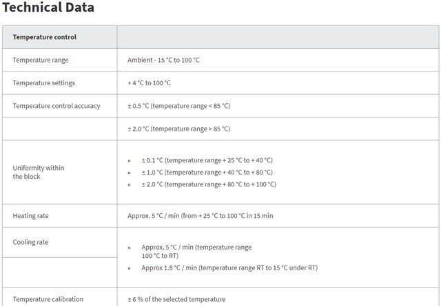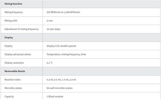 - Removable block modules for microtubes up to 2 ml * Three instruments in one: thermomixer, mixer, incubator * Temperature range: RT - 15 °C to 100 °C
