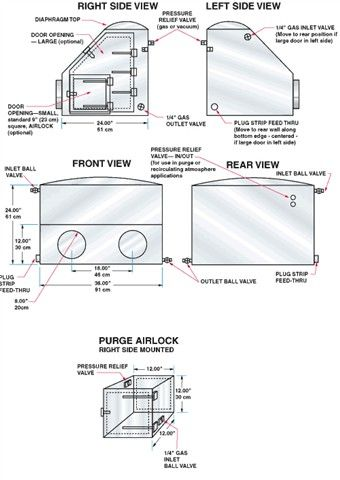 The patented Diaphragm Top increase the ease with which the operators hands enter and exit the glove box and increase cost savings as less glove box gas is expelled to the lab atmosphere. For applications involving large equipment, request the optional, fully gasketed 32" x 20" (81 cm x 51 cm) removable back wall or oversize door in the side wall. Dual 8" (20 cm) round arm ports come equipped with flanges for easy connection of gloves or gloveless sleeve, which may be ordered as desired. The optional Arm Port Plugs maintain an airtight chamber while gloves are changed.